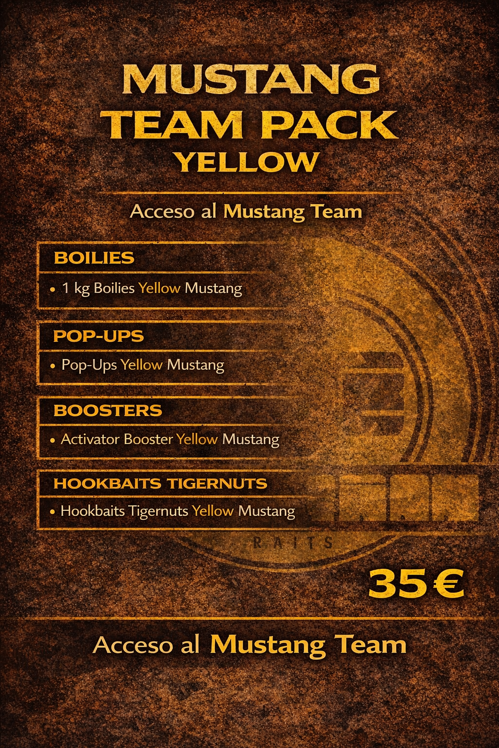 Este pack reúne una combinación equilibrada de productos del sabor Yellow Mustang, desarrollados y testados para ofrecer máxima atracción y rendimiento en tus sesiones de carpfishing.